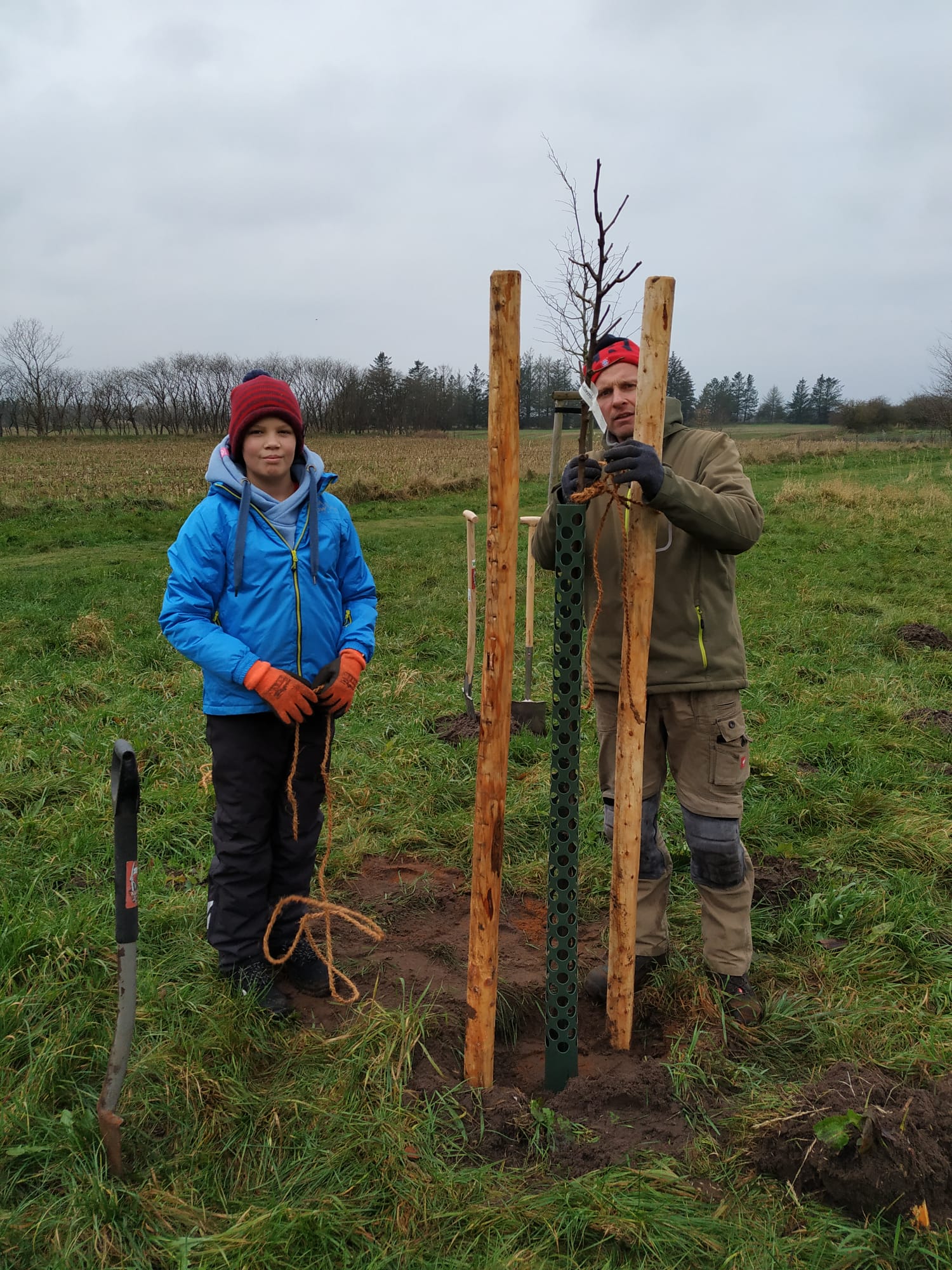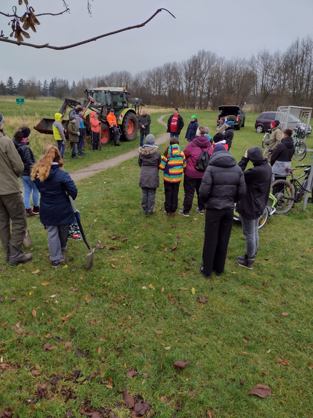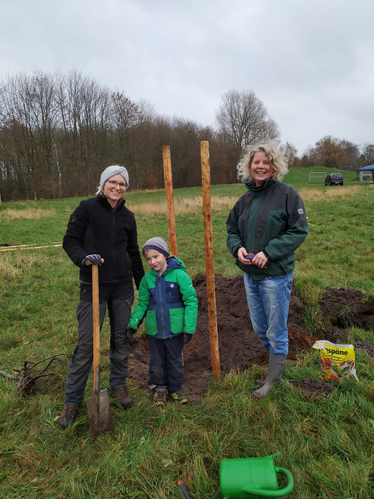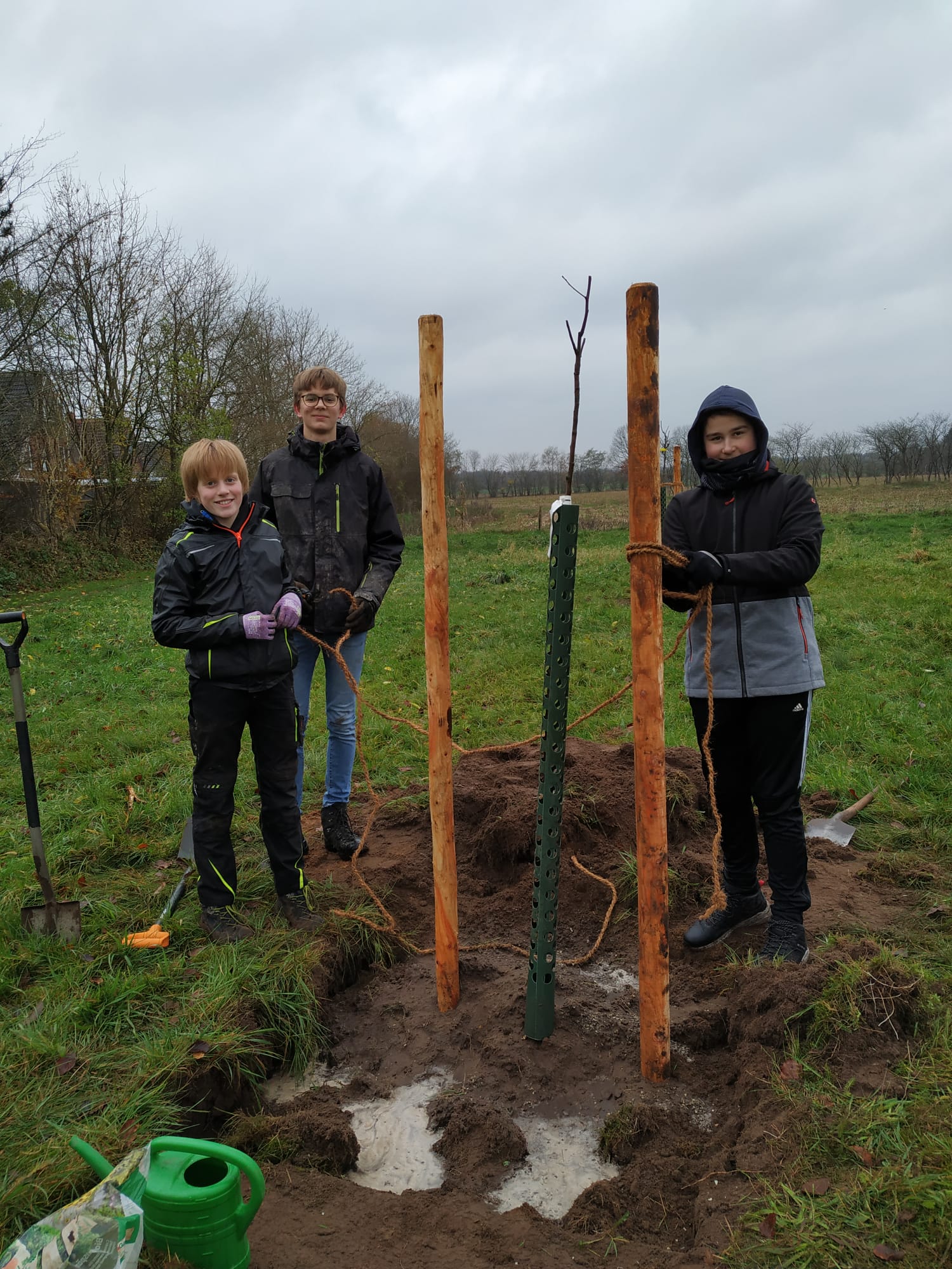 Aufgrund der Bewilligung des vorzeitigen Maßnahmenbeginns und der finanziellen Unterstützung der KFZ-Service Großenwiehe GmbH & Co. KG konnte die erste Hälfte der Bäume schon mit großem Engagement des Jugendbeirates Großenwiehe und des Dorfverschönerungsvereins am 27.11.2021 im Naturschutzgebiet hinter der „Hundewiese“ am Kastanienweg-Spielplatz eingepflanzt werden.